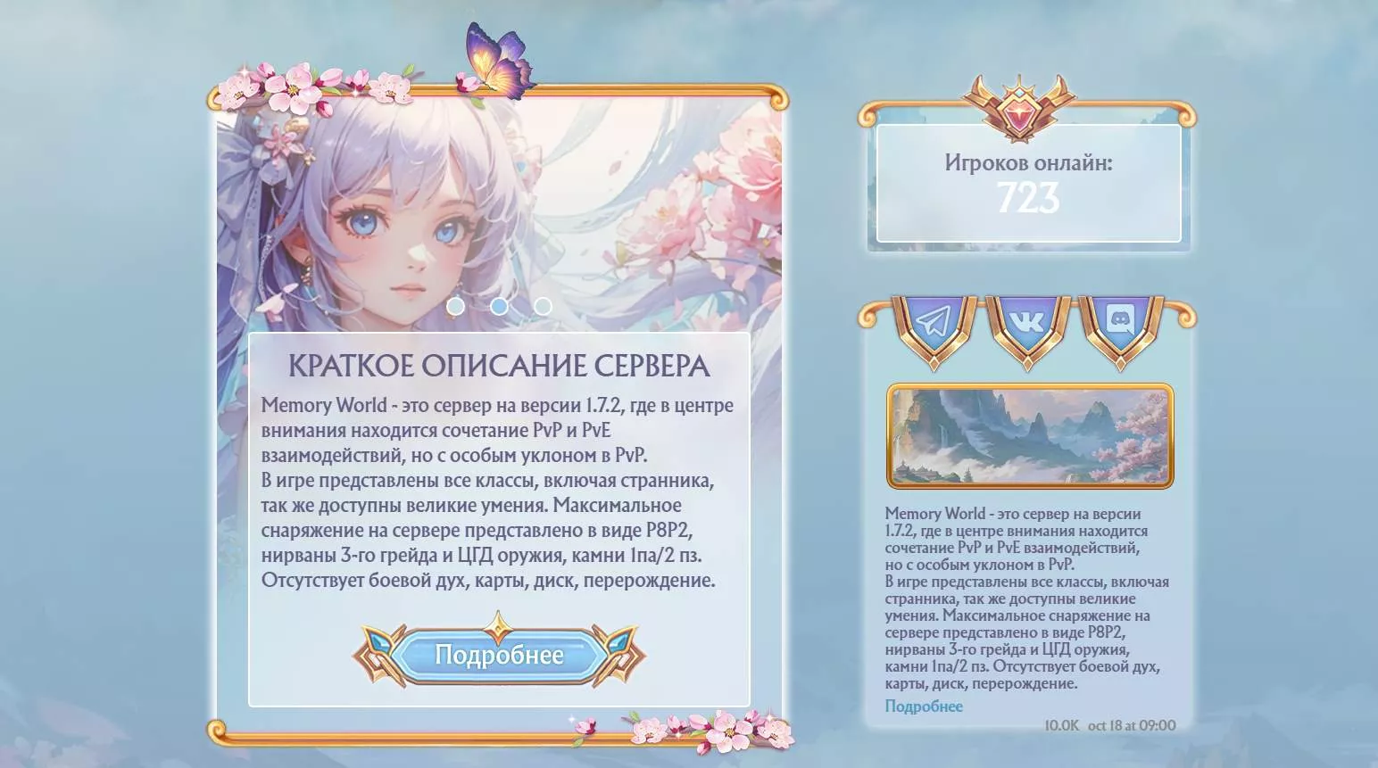 Memory World is a server on version 1.7.2, where the focus is a combination of PvP and PvE interactions, but with a special bias in PvP. All classes are represented in the game, including the wanderer, as well as great skills are available. Maximum equipment on the server is represented in the form of P8P2, nirvana 3rd grade and DHD weapons, stones 1pa/2 pz. No morale, maps, disk, rebirth.